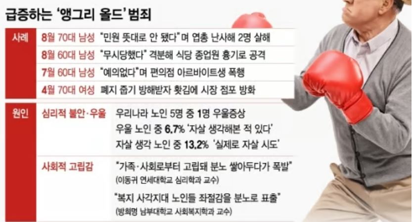 - 사회적 고립과 소외감: 가족 해체, 1인 가구 증가 등으로 인해 노인들은 사회적 유대감이 약화되고 고립감을 느끼기 쉽습니다. 특히 친구나 가족과의 교류가 줄어들면서 소외감과 외로움이 깊어지고, 이는 우울증이나 분노와 같은 부정적인 감정을 증폭시켜 범죄로 이어질 수 있습니다. 뉴스를 보면, 사소한 시비로 강력범죄를 저지르는 노인들의 사례가 자주 등장하는데, 이는 사회적 소외감과 고립으로 인한 분노 표출의 결과로 볼 수 있습니다.